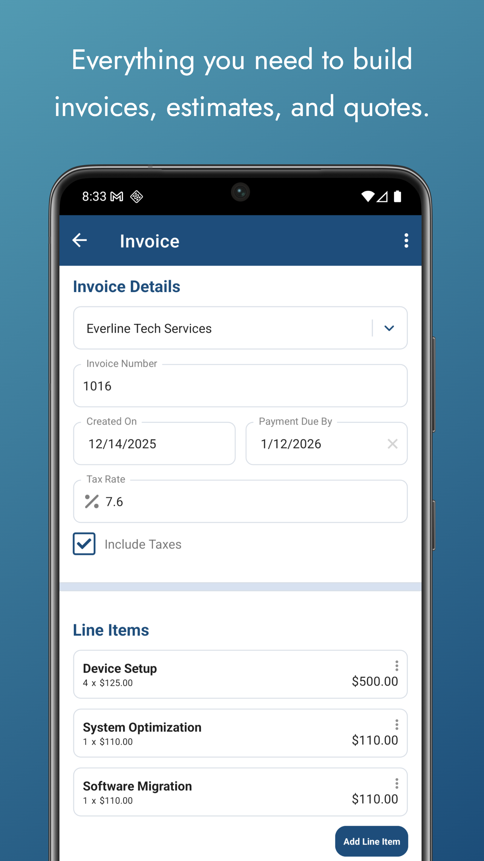 Quickly create professional Invoices, Estimates, and Quotes with just a few taps. Add line items, set dates, apply taxes, and generate polished documents without unnecessary steps.
