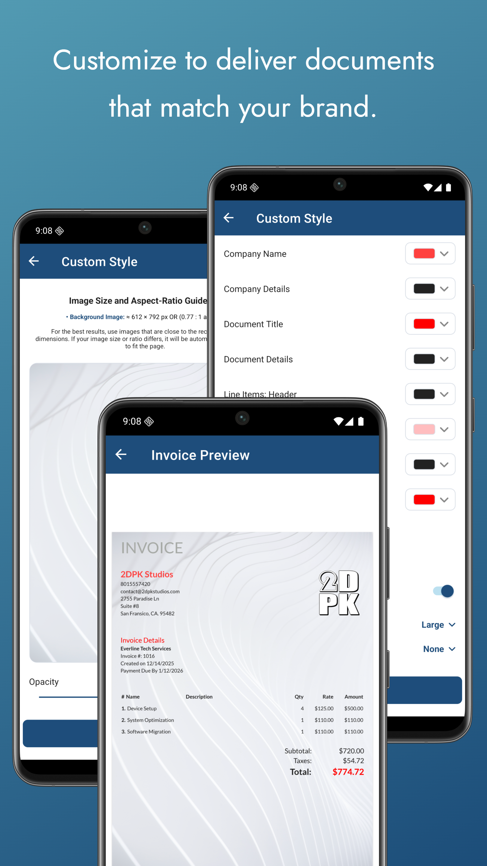 Customize the look of your documents with colors, text styling, and background images to match your brand and deliver a professional impression.